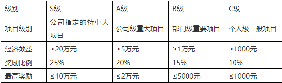 公司推行項目改善從質(zhì)量、成本、生產(chǎn)、交付、安全、設備改進、團隊及技術(shù)改善類等方面推進,不斷完善制度流程化建設,同時建立獎勵機制,按改善項目重要等級分S級、A級、B級、C級,按級別比例進行最高獎勵。