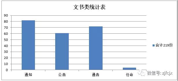 公司所有的文書類如:通知、通告、公告、任命等統(tǒng)一有正規(guī)格式,經(jīng)編輯、審核、批準,統(tǒng)一由總裁辦渠道發(fā)布。經(jīng)對2018年文書類統(tǒng)計,各類發(fā)布如下:通知82份、公告61份、通告72份、任命4份,合計共發(fā)布文書類219份。