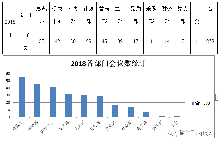 根據(jù)《公司會議管理制度》規(guī)定要求,各部門需用到公司會議室的會議需以《會議通知》的形式到總裁辦進行登記,同時以《會議紀要》的形式到總裁辦進行備案。經(jīng)2018年各部門到總裁辦會議數(shù)統(tǒng)計如下:
