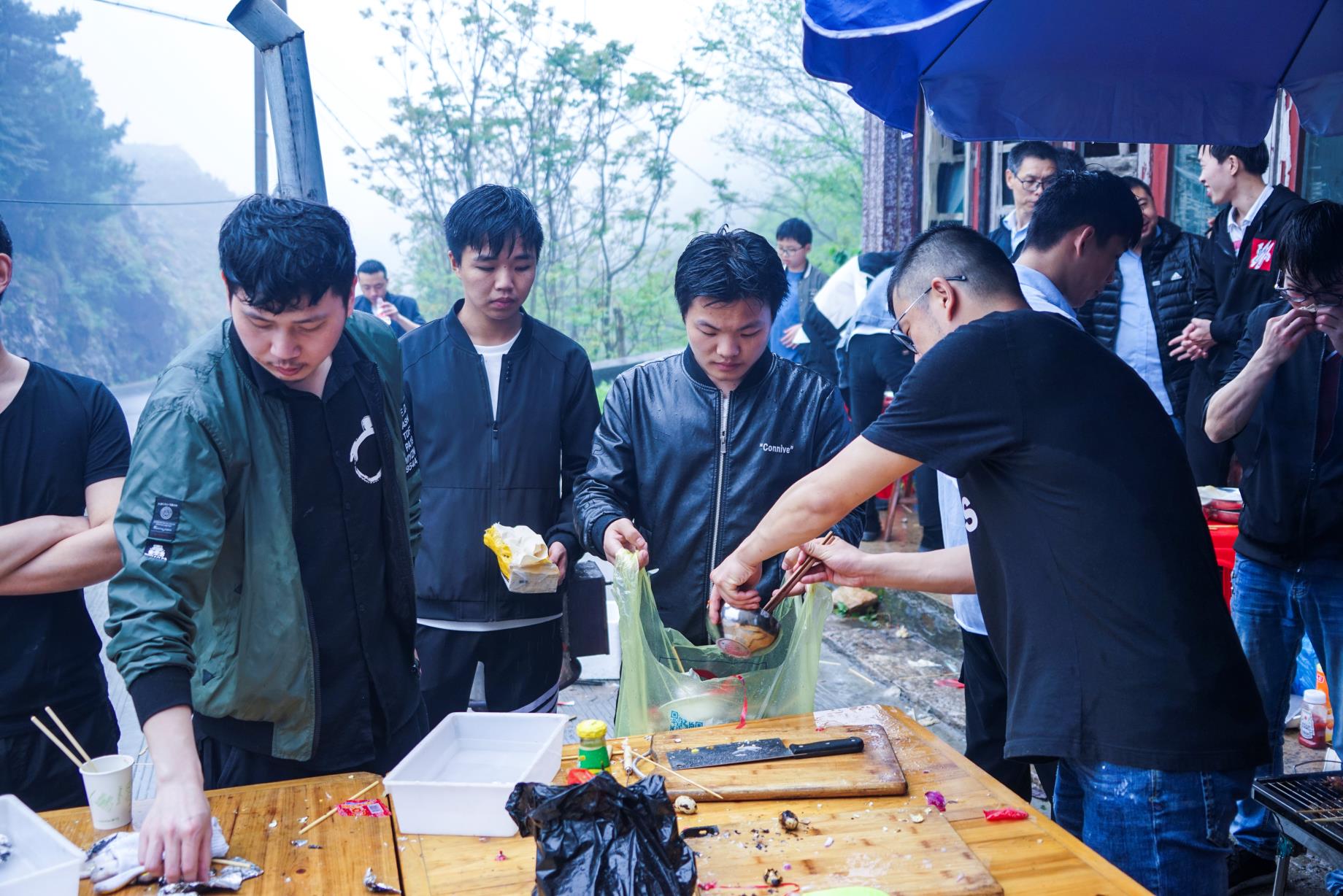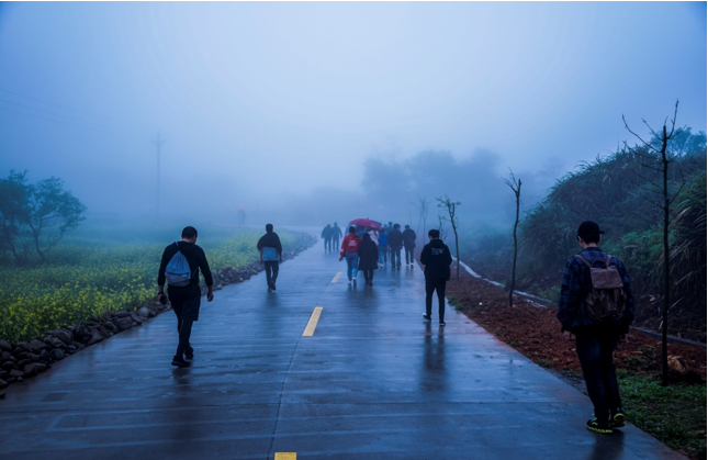 在各組成員吃飽喝足充滿能量之后 ,開始了此次活動(dòng)最高潮部分——暴走。在開始暴走之前,參加暴走的全體成員在自行車協(xié)會(huì)牌前集合進(jìn)行了合影留念,之后開始了暴走活動(dòng)。天氣依然是跟早上一樣,三米開外的地方,似乎什么都看不清了,天空中也下著蒙蒙細(xì)雨,但一點(diǎn)也不影響我們的心情。大家一邊歡快地聊著天,一邊向上地攀登者。享受著霧蒙蒙的風(fēng)景,在這詩(shī)情畫意中繼續(xù)著。很快我們從平坦的水泥路轉(zhuǎn)到了泥濘的山路中。疊翠的峰巒、茂密的森林和曲折盤旋的山路讓我們不禁陶醉其中,盡情領(lǐng)略大自然的風(fēng)情。各個(gè)部門之間都彼此相互鼓勵(lì)、相互協(xié)助,不斷挑戰(zhàn)著自己。